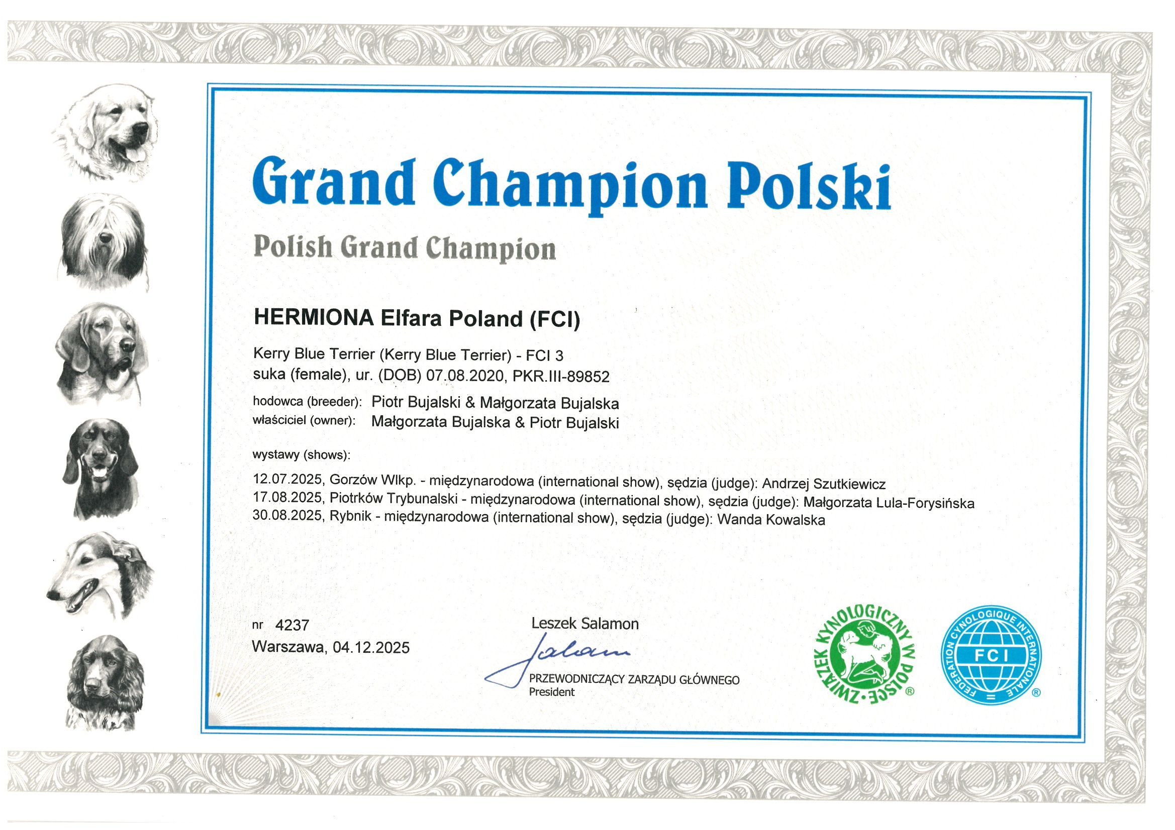 11.12.2025r. Dotarł do Nas Dyplom GRAND CHAMPIONA POLSKI naszej 💖 HERMIONY 💖